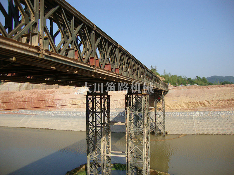 特點:本鋼橋由國防科技大學全程指導和監(jiān)督安裝,滿足荷載80T施工車輛通行,因施工場地要求,采用貝雷梁組合式橋墩,安裝拆除方便,穩(wěn)定性好。采用推出法安裝,安裝周期20天,于2011年5月25日通車。