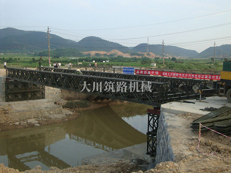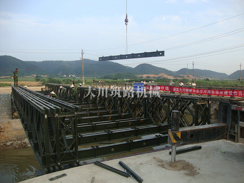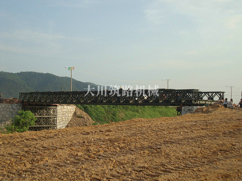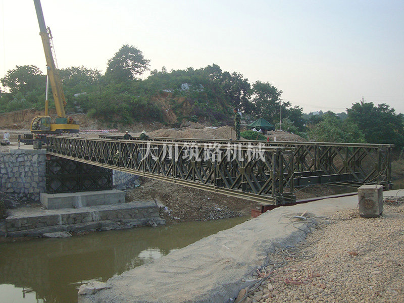 特點:本鋼橋由國防科技大學全程指導和監(jiān)督安裝,滿足荷載80T施工車輛通行,因施工場地要求,采用貝雷梁組合式橋墩,安裝拆除方便,穩(wěn)定性好。采用推出法安裝,安裝周期20天,于2011年5月25日通車。